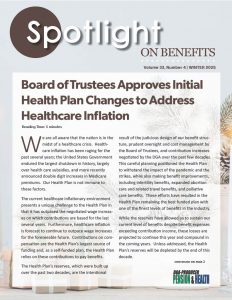 - Board of Trustees Approves Initial Health Plan Changes to Address Healthcare Inflation. The nation is in the midst of a healthcare crisis and healthcare inflation raging for the past several years with the largest government shutdown in history (largely over health care subsidies and double digit increases in Medicare premiums). Our Health Plan is not immune to these factors. Over the past two decades, the Health Plan has built up reserves that allowed us to sustain our current level of benefits despite benefit expenses exceeding contribution income. These losses are projected to continue this year and compound in the coming years. Unless addressed, the Health Plan’s reserves will be depleted by the end of this decade. Accordingly, the Board has taken the initial steps outlined below to address these challenges. The Board of Trustees does not make benefits changes such as these without considerable deliberation and forethought. Future changes are being given the same careful consideration, with the main goal being to preserve the vitality of the Health Plan for years to come for you and your families.