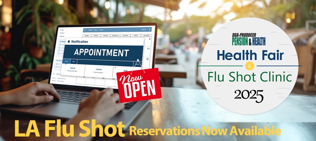 The DGA-Producer Pension & Health Plans will be hosting its annual health fair and free flu shot clinic exclusively for DGA members (regardless of Health Plan coverage status) and their families in New York City this fall. Reservations are recommended for all flu shots and can be made below.