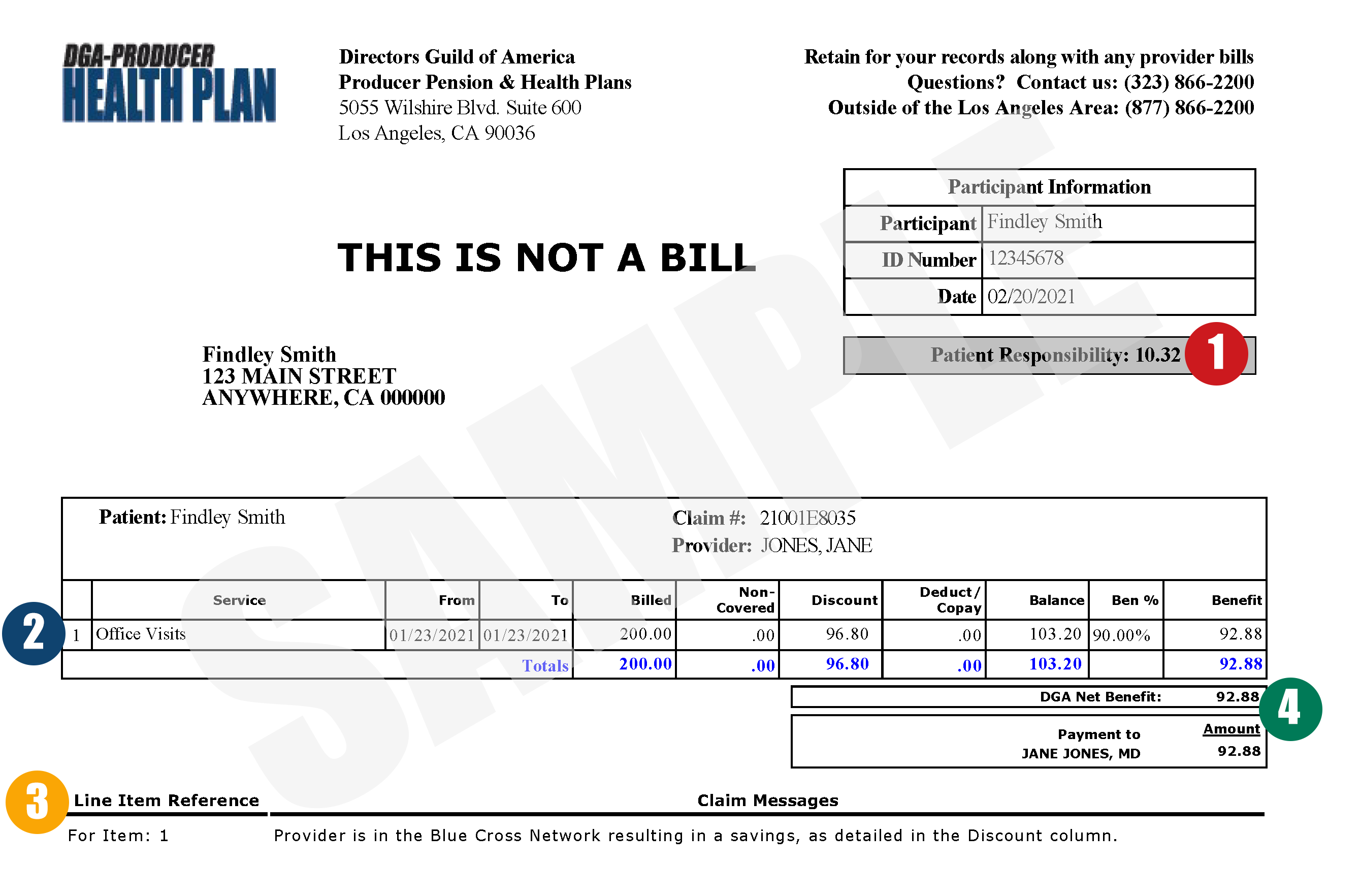 The sample below notes the most important sections of your EOB.