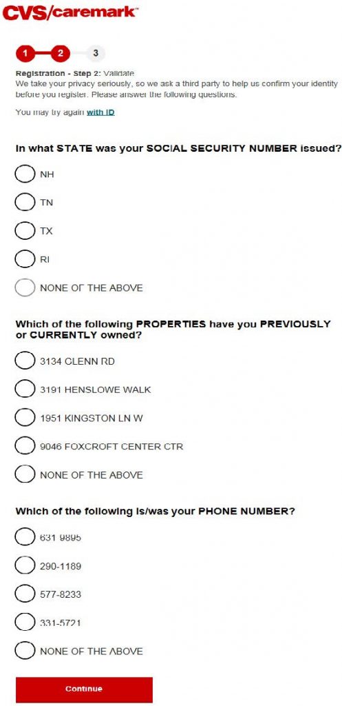3. You will then be asked three questions that were designed by a third-party company for your privacy. These questions are meant to confirm your identity. Sample questions include: