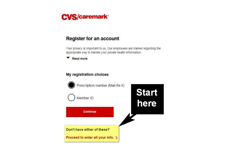 Choose Don’t have either of these? Proceed to enter all of your info if you need to register without a prescription number or member ID.