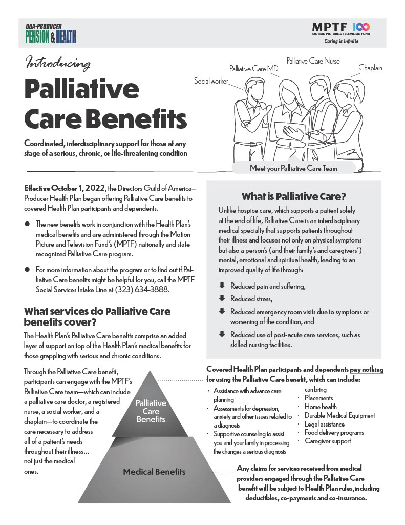Effective October 1, 2022, the Directors Guild of America–Producer Health Plan (the “Health Plan”) will offer Palliative Care benefits to covered Health Plan participants and dependents. The new benefit will work in conjunction with the Health Plan’s medical benefits and be administered through the Motion Picture and Television Fund’s (MPTF) nationally and state recognized Palliative Care program. For more information about the new Palliative Care benefit or to find out if it might be helpful for you, call the MPTF Social Services Intake Line at (323) 634-3888.