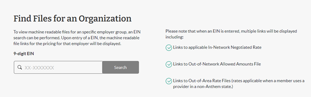 - Visit Anthem’s MRF website by clicking here or access it via the link: https://www.anthem.com/ca/machine-readable-file/search/.