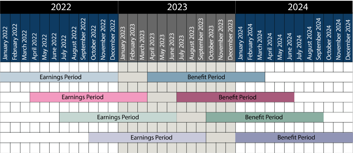 Under the new threshold, to qualify for benefits under the Choice Plan, you must earn a minimum of $37,000 during any 12-month period beginning January 1, April 1, July 1 or October 1 in 2022. Only allowable earnings covered under each Bargaining Agreement accrue toward the earnings threshold. The chart below reflects the related earning and benefit periods.
