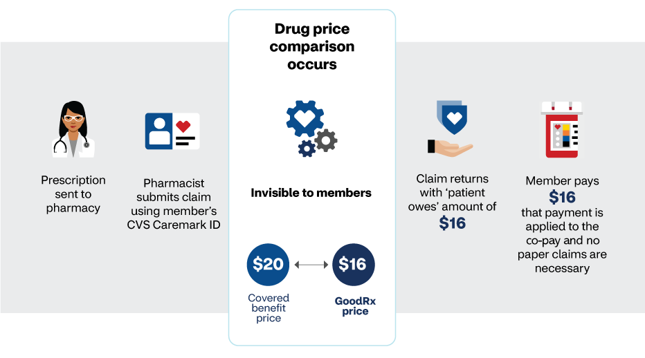 The lower price will be charged automatically. All participants need to do is fill their prescription at a network pharmacy, using their CVS Caremark benefit card. CVS Caremark will compare your regular generic drug co-payment amount to the GoodRx discounted price and select the lower price of the two. The graphic below details the process.