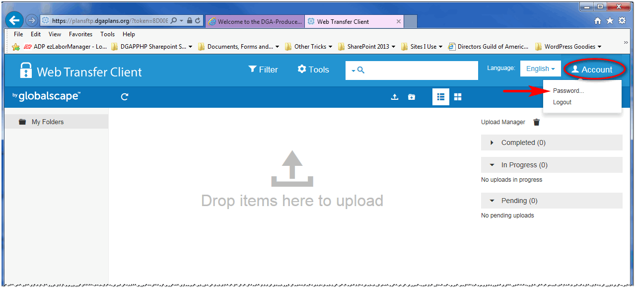 - On the Web Transfer Client page, click the Account button in the upper right corner of the window, then choose Password… from the menu.