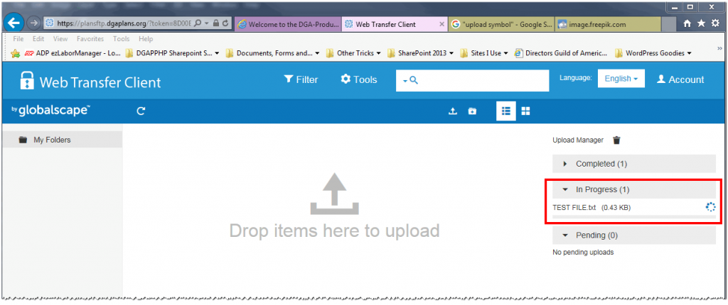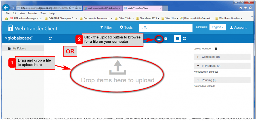 - Once you have logged in, you have two ways to upload your file: (1) drag and drop your file into the designated area of the Web Transfer Client window or (2) click the Upload button () to browse to a file on your computer.