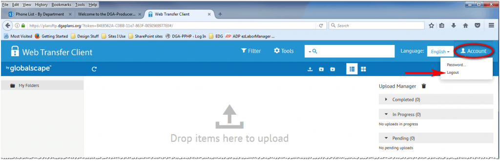 - To log out after you have completed your upload(s), either (1) close your Internet Explorer browser window or (2) click the Account button in the upper right corner and choose Logout from the menu.