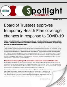 The Spring issue of the Spotlight on Benefits newsletter is available now. This issue includes important details regarding two temporary Health Plan coverage changes approved by the Board of Trustees: (1) effective March 13, 2020, a waiver of all patient cost sharing (i.e., co-pays, co-insurance and deductibles) for COVID-19 related testing, and (2) effective March 16, 2020, temporary coverage of both network and non-network telemedicine and telepsychology visits. Both changes are in effect until further notice and are subject to existing Health Plan rules.