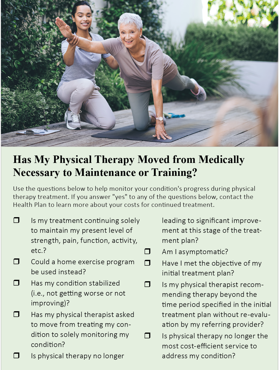 Ongoing services like physical therapy may reach a point where medically necessary therapy (which is covered by the Health Plan) becomes maintenance or training (which is considered not medically necessary and therefore, is not covered by the Health Plan). Continued treatment without a clear understanding of whether it still meets the standard of medical necessity increases your chances of out-of-pocket costs for such treatment.