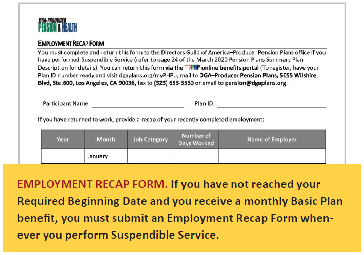 If you are receiving a monthly Basic Plan benefit, you must notify the Plans office, in writing, within 21 days upon starting employment that is considered Suspendible Service. You can do this by filling out and returning the Employment Recap Form available at www.dgaplans.org/forms/pension. If you do not notify the Plans office, and it is later determined that your benefits should have been suspended, the overpayments will be recovered from your future benefit payments.